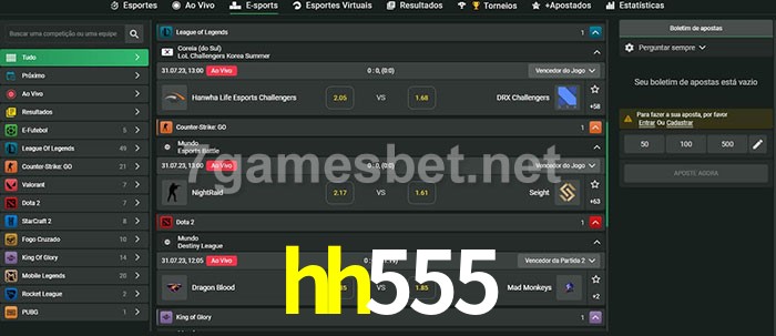 O hh555 oferece uma grande seleção de opções de apostas em e-sports com probabilidades competitivas